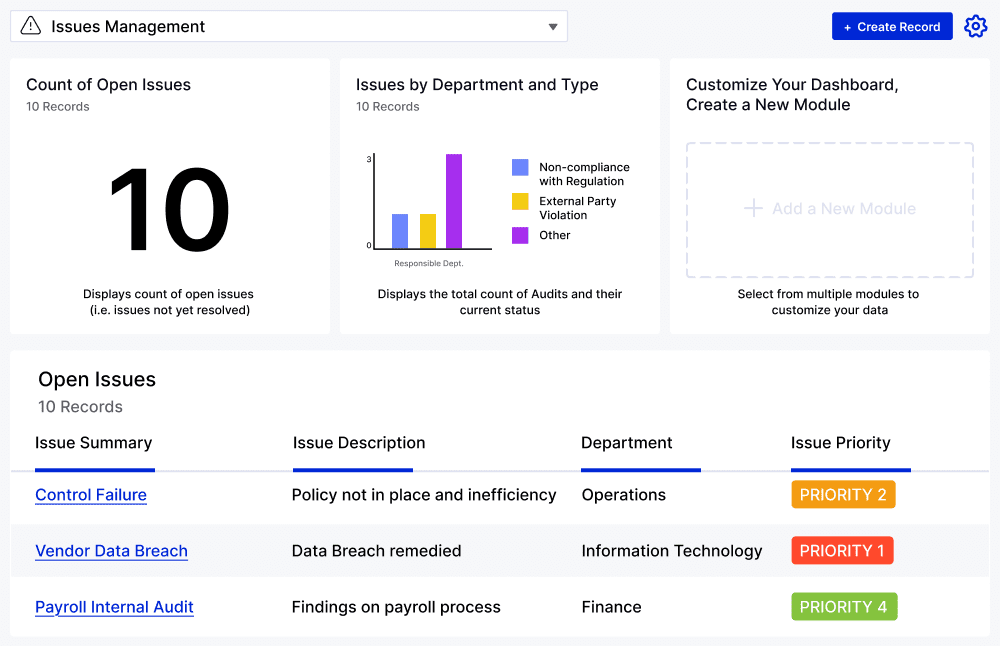 The Application strengthens risk and compliance programs by providing a centralized platform for logging, tracking, and resolving issues across traditionally siloed teams. The Application accelerates resolution and improves program maturity through automated priority scoring, standardized workflows, and near real-time risk insights —ensuring a proactive approach to risk mitigation across the enterprise.