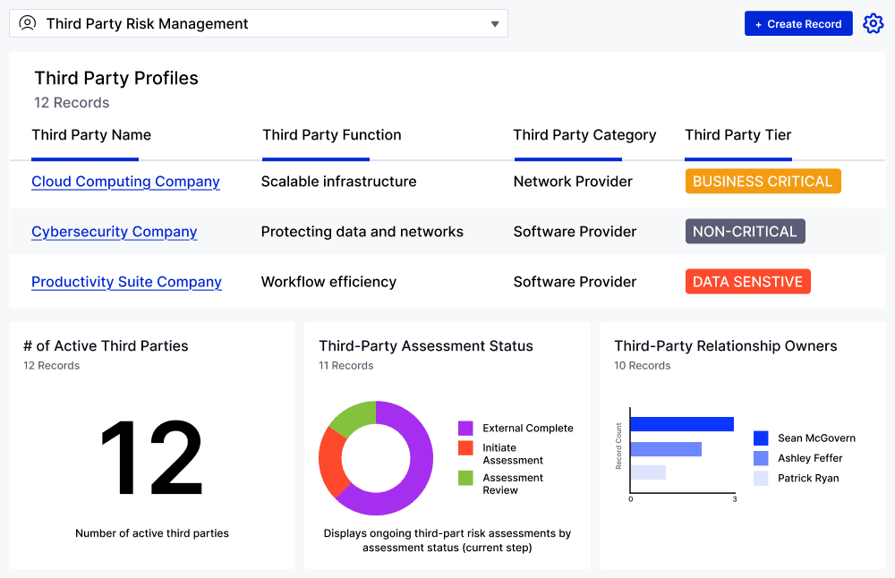 The Application provides the visibility needed to safely onboard new vendors while streamlining assessment, risk mitigation, and offboarding processes. This Application saves teams time with out-of-the-box questionnaires aligned to industry standards — like SIG, NIST, and CAIQ — automated workflows, and near real-time reports on third-party risk.