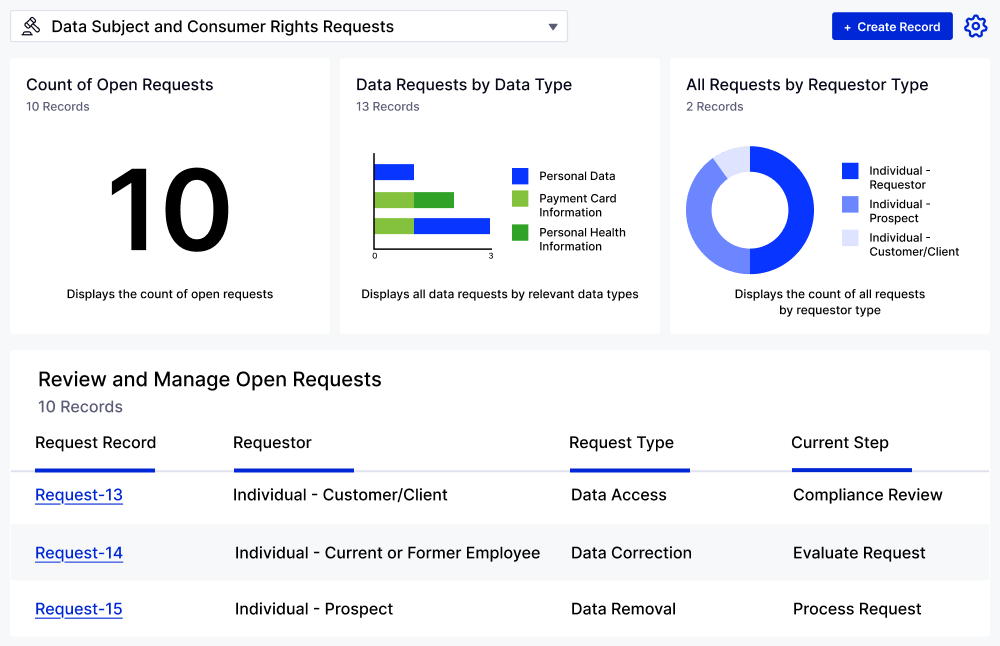 Generate pre-built and custom reports to visualize the status and results of request evaluations. Access over a dozen user-friendly reports and dashboards that detail requests by status, due date, type, submissions, and more, making it easier to monitor and manage your data subject and consumer rights requests.